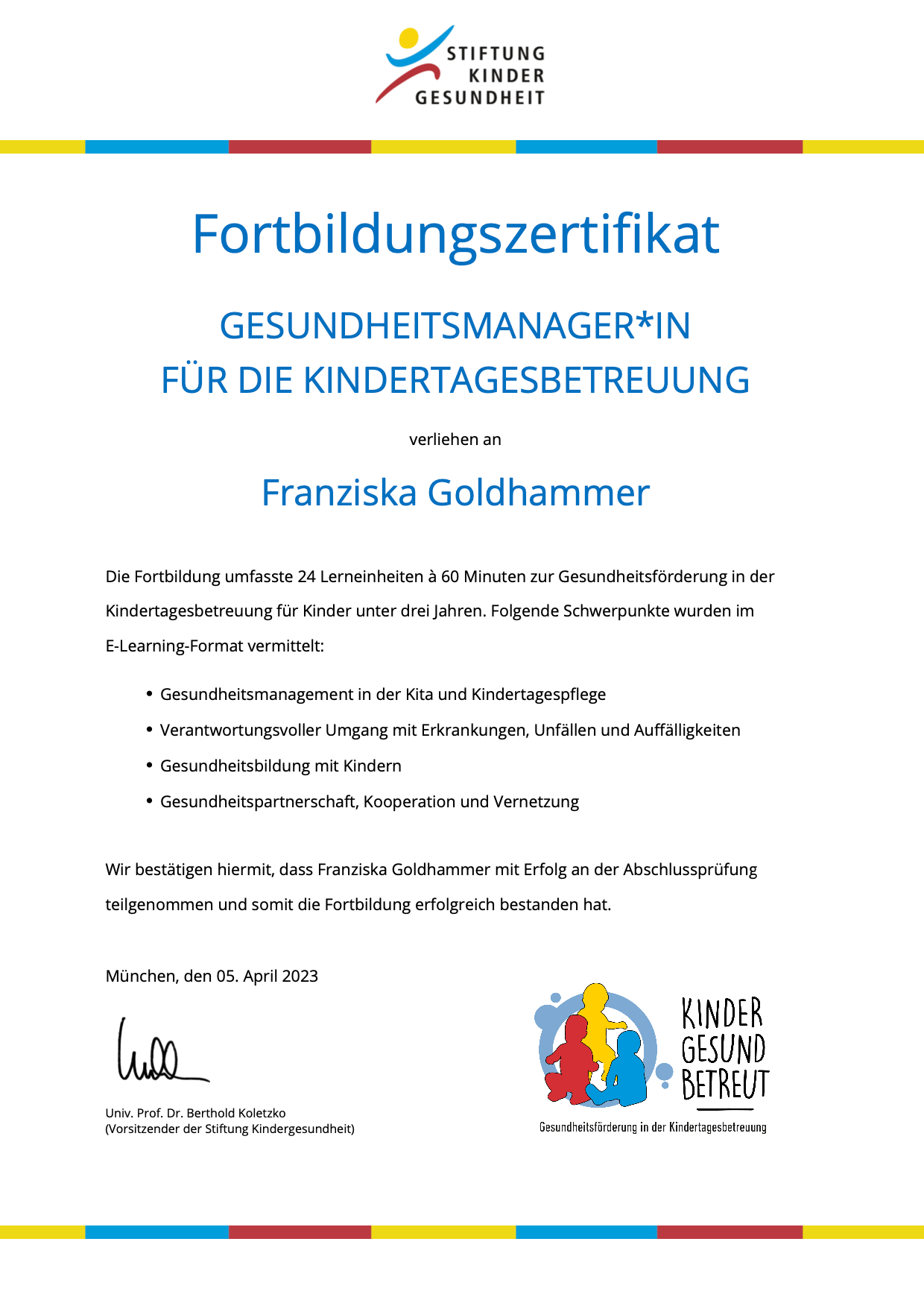 Die Fortbildung umfasste 24 Lerneinheiten à 60 Minuten zur Gesundheitsförderung in der Kindertagesbetreuung für Kinder unter drei Jahren.