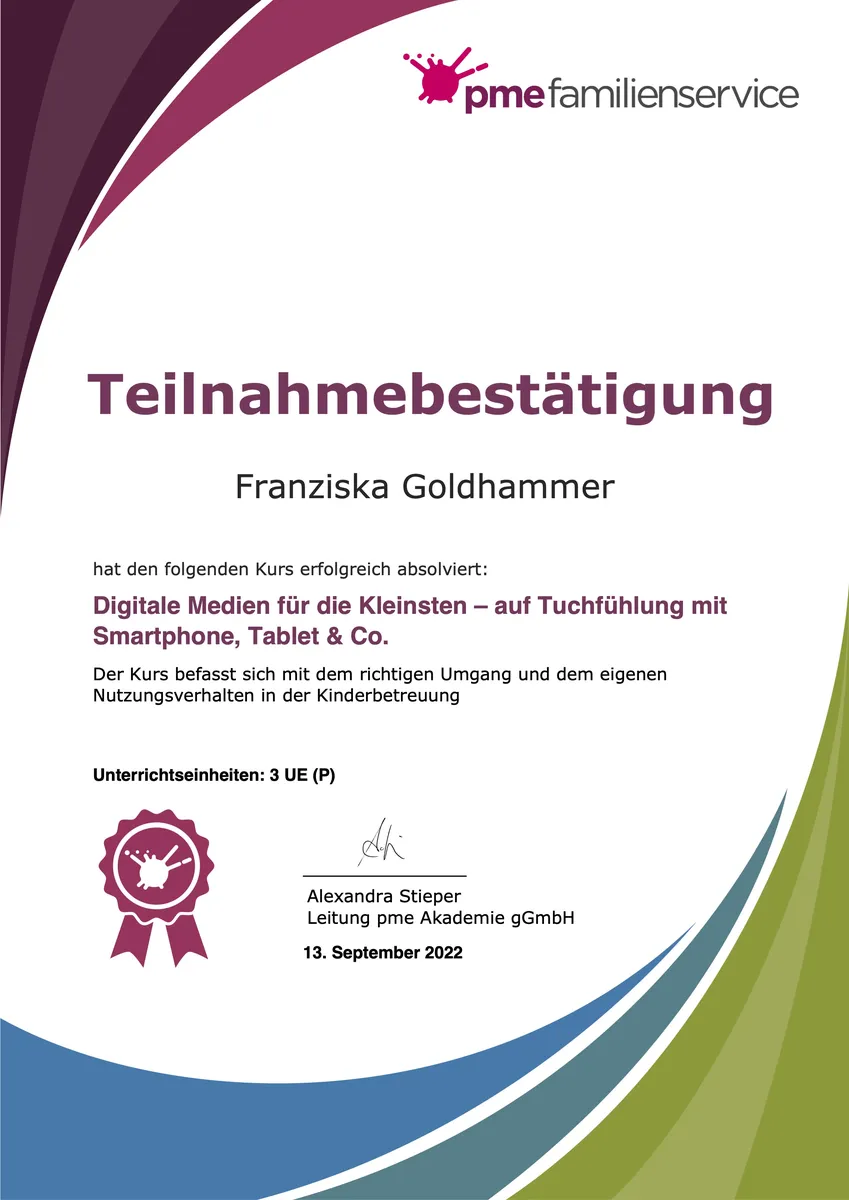 Regelmäßige Weiterbildung ist mir wichtig, um meinen Qualitätsanspruch in der Betreuung und Entwicklung ihres Kindes gerecht zu werden.