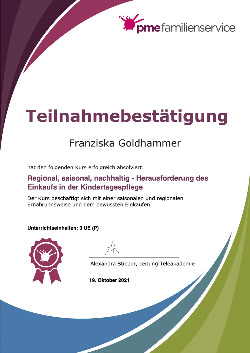 Teilnahmebescheinigung "Regional, saisonal, nachhaltig - Herausforderung des Einkaufs in der Kindertagespflege"