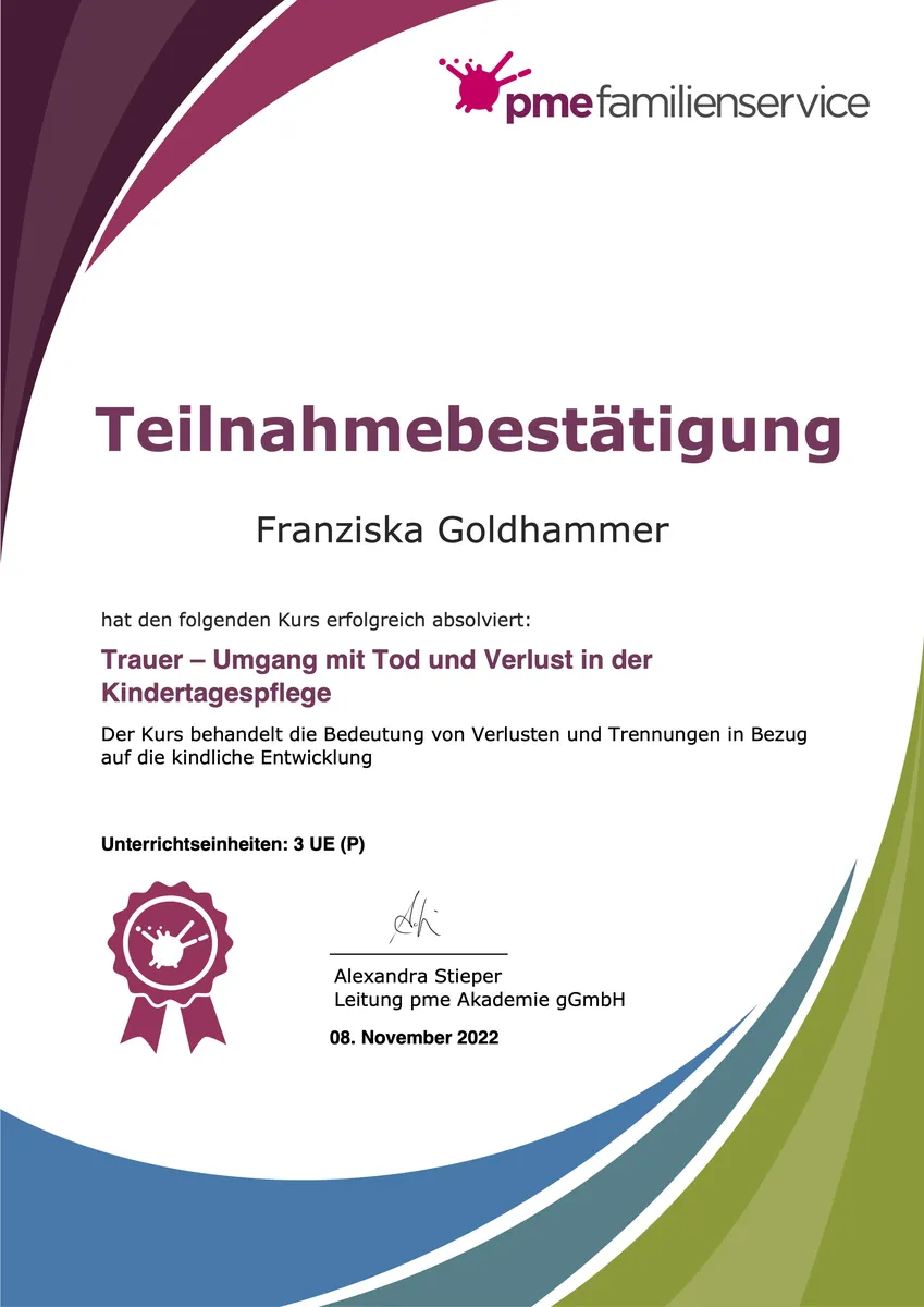 Teilnahmebescheinigung "Trauer - Umgang mit Tod und Verlust in der Kindestagespflege"