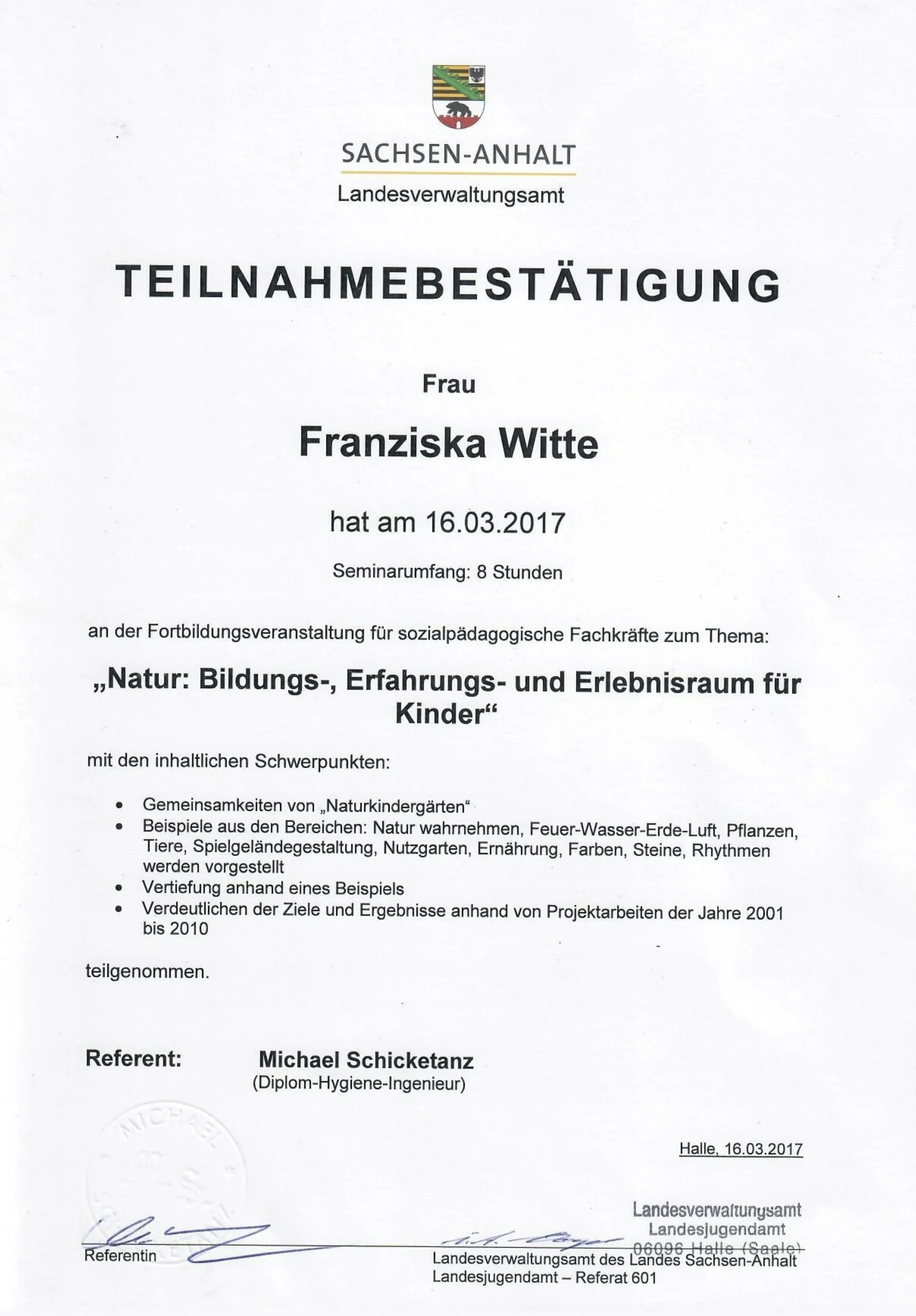 Teilnahmebescheinigung "Natur: Bildungs-, Erfahrungs- und Erlebnisraum für Kinder"
