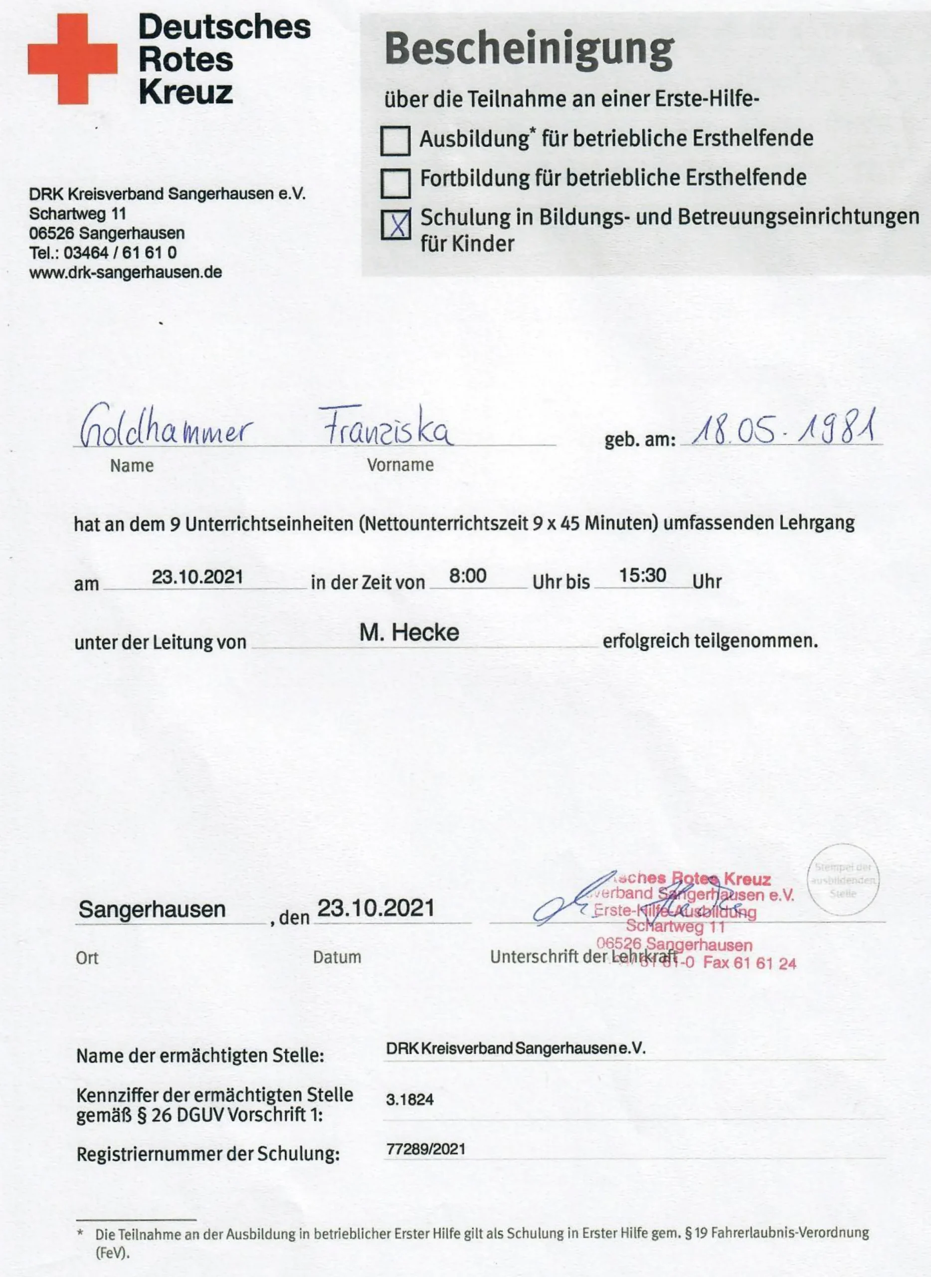 Für alle Fälle: Durch meine regelmäßige Teilnahme an DRK Schulungen bin ich auf alle Situationen vorbereitet, wenn es darum geht, Ihrem Kind zu helfen.