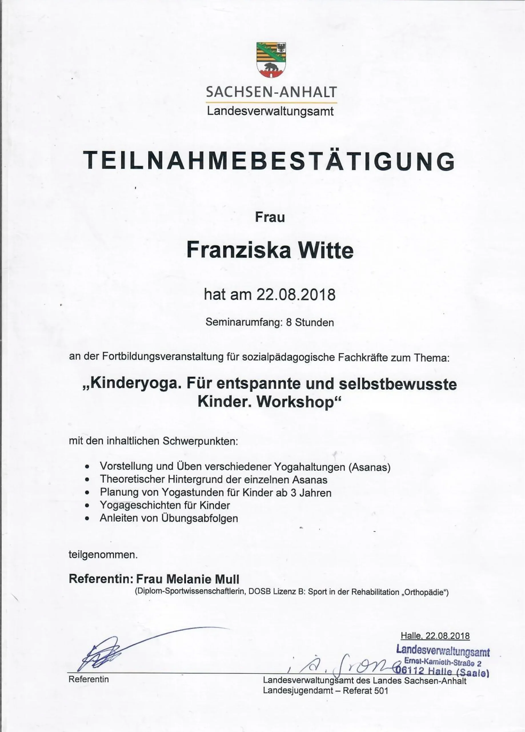 Teilnahmebescheinigung "Kinderyoga. Für entspannte und selbstbewusste Kinder. Workshop"