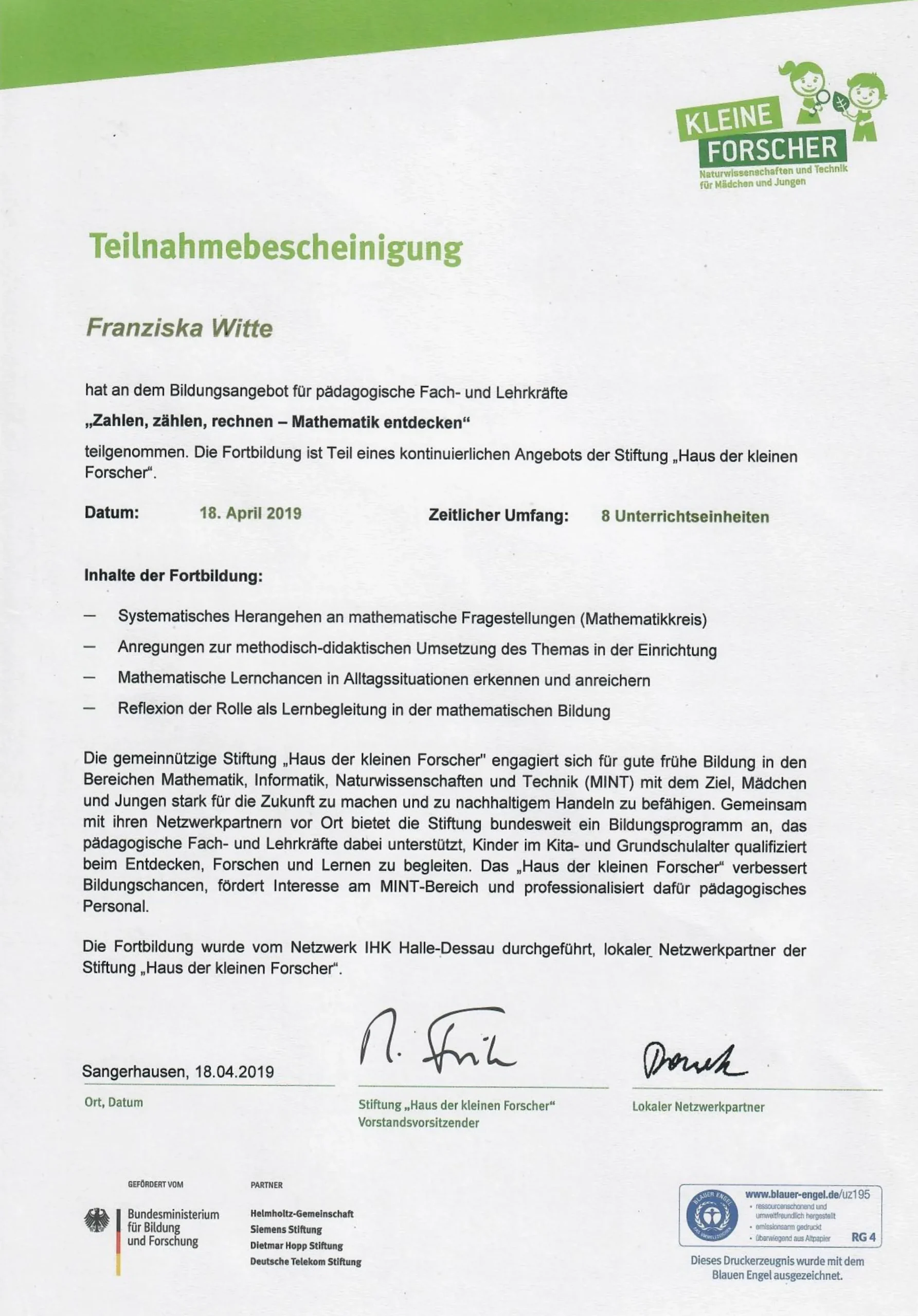 Teilnahmebescheinigung Kleine Forscher "Zahlen, zählen, rechnen - Mathematik entdecken"
