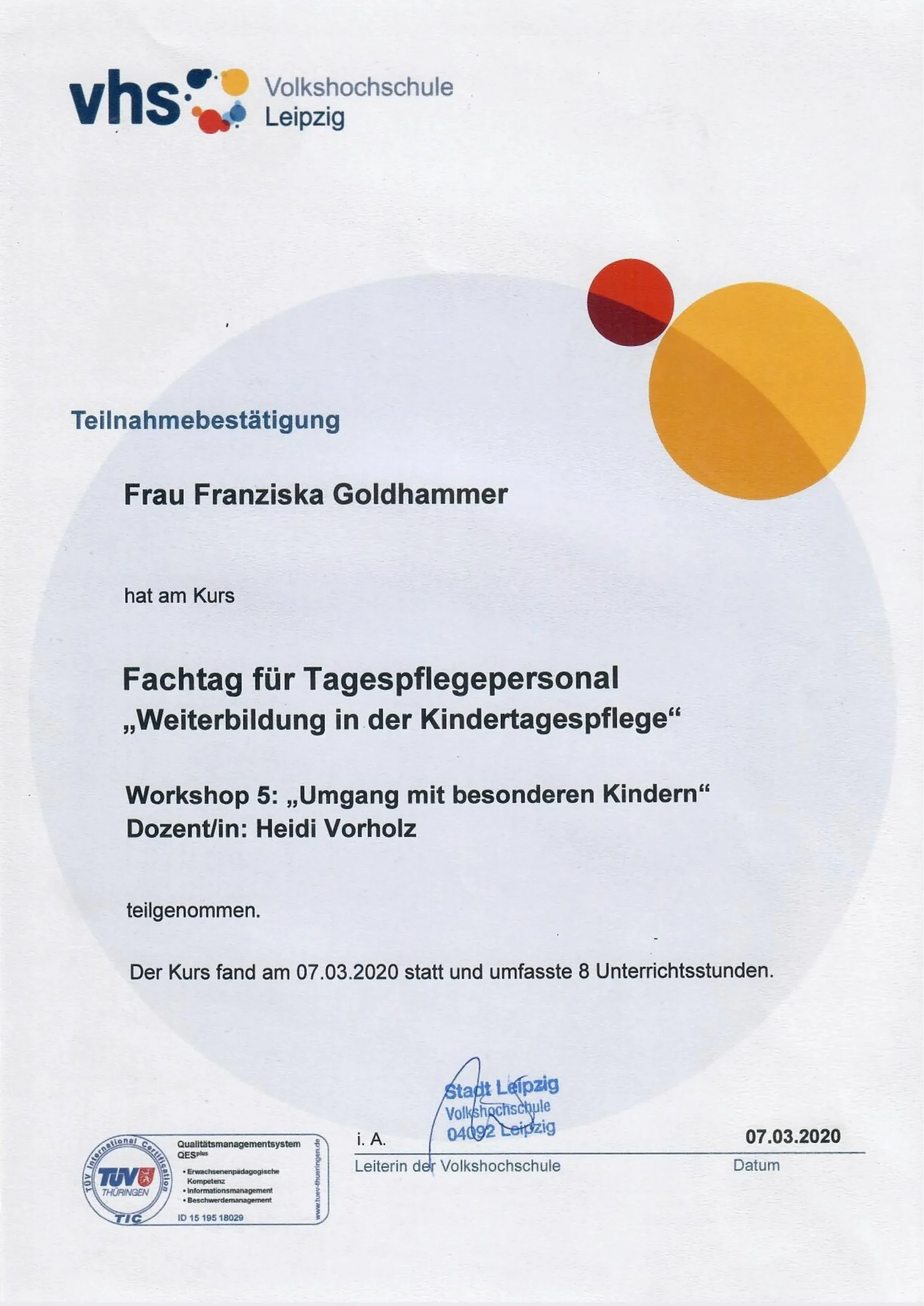 Teilnahmebestätigung Fachtag für Tagespflegepersonal "Umgang mit besonderen Kindern"