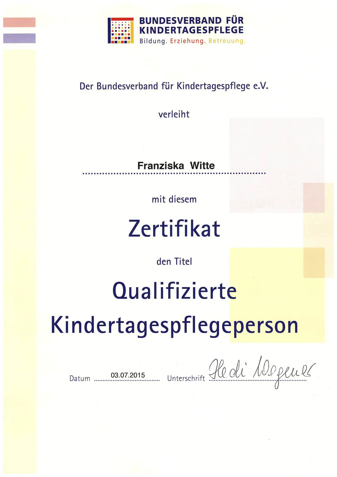 Der Bundesverband für Kindertagespflege e.V. hat mich zudem als Qualifizierte Kindertagespflegeperson zertifiziert.